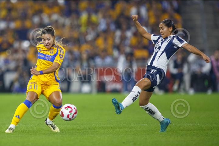 GUADALUPE, NUEVO LEÓN, 25NOVIEMBRE2024.- Lydia Rangel de Tigres Femenil, se disputa el balón con Dania Pérez de Rayadas, en el estadio BBVA, partido de vuelta de la Final Femenil, Apertura 2024. Segundo tiempo global Rayadas: 2 - Tigres: 3. FOTO: GABRIELA PÉREZ MONTIEL / CUARTOSCURO.COM