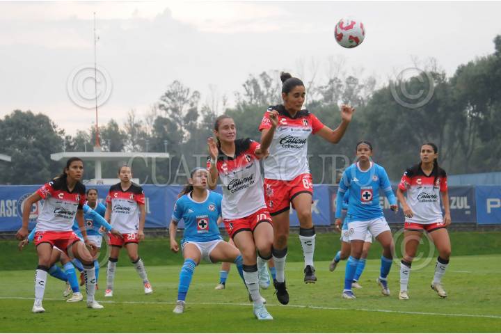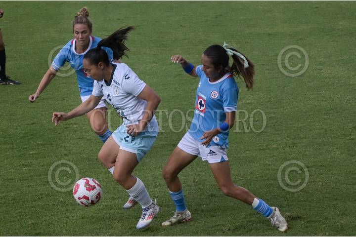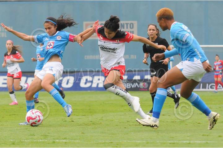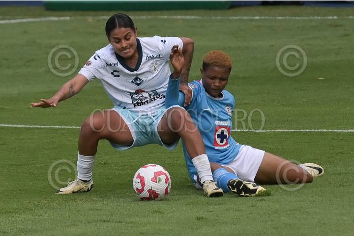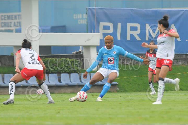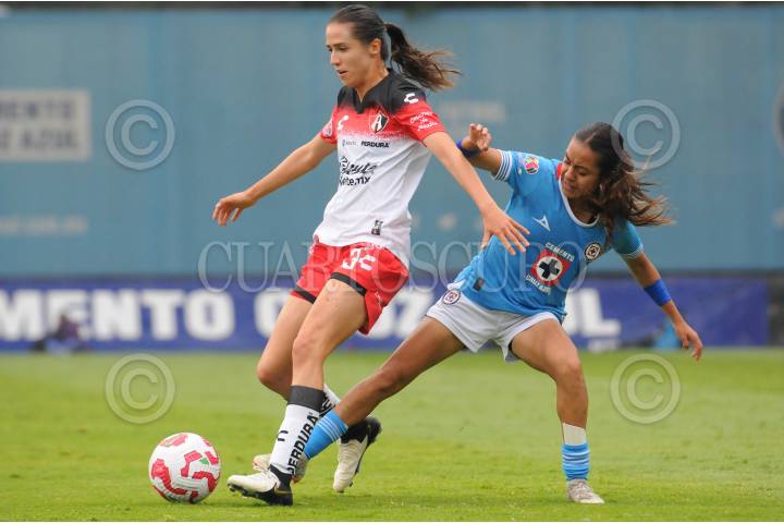 CIUDAD DE MÉXICO, 28JULIO2024.- Ana García, mediocampista de Cruz Azul, persigue a Maritza Maldonado, del Atlas. FOTO: DANIEL AUGUSTO /CUARTOSCURO.COM