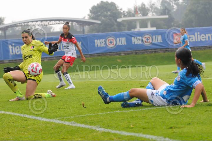 CIUDAD DE MÉXICO, 28JULIO2024.- Daniela Solera, portera del Atlas, rechaza un disparo de la delantera del Cruz Azul, Ana García. FOTO: DANIEL AUGUSTO /CUARTOSCURO.COM