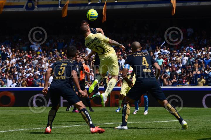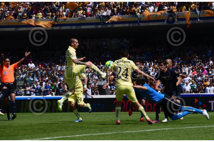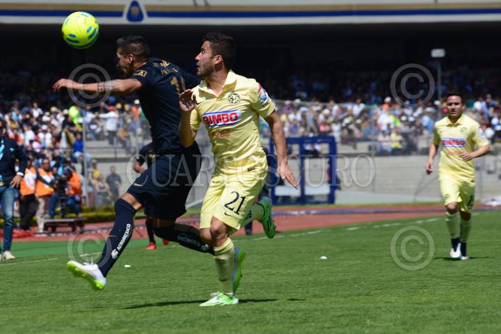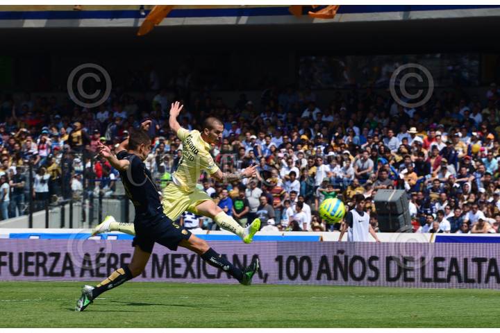 MÉXICO, D.F., 22FEBRERO2015.- Dario Benedetto anota el primer gol del partido favoreciendo a las aguilas del América 1 a 0 sobre los Pumas de la UNAM. FOTO: ISABEL MATEOS /CUARTOSCURO.COM