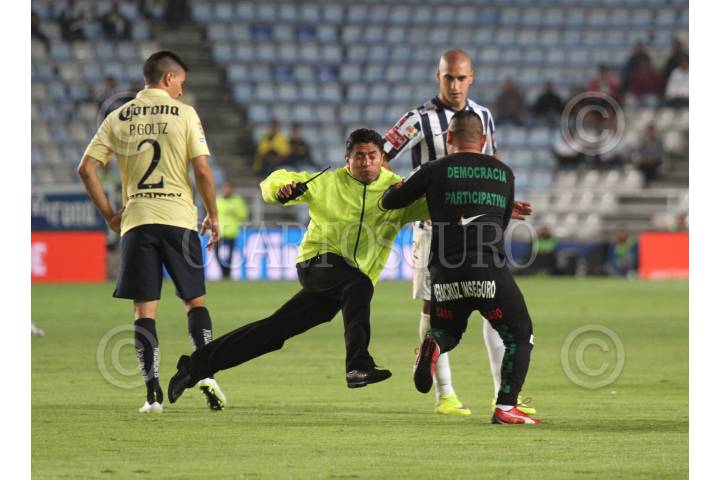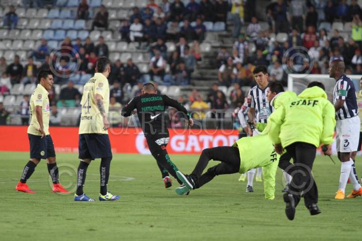 PACHUCA, HIDALGO, 13MAYO2015.- En el partido de ida de cuartos de final de la Liguilla, Clausura 2015, los Tuzos del Pachuca ganan en el medio tiempo tres goles por uno a las Aguilas del América. En la imagen, un hombre ingresa a la cancha con consignas en contra del gobierno mexicano, con el 43 por Ayotzinapa y por justicia por los niños de la guardería ABC. FOTO: ADOLFO VLADIMIR /CUARTOSCURO.COM