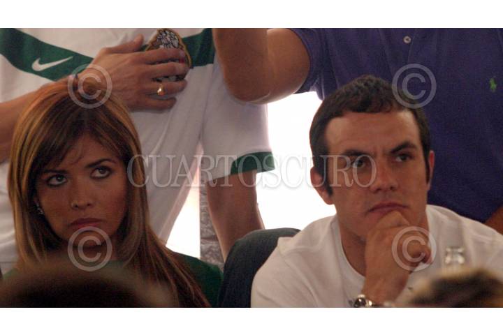 MÉXICO, D.F. 16JUNIO2006.- El futbolista Cuauhtémoc Blanco, presenció en su restaurante al sur de la ciudad, el partido de futbol entre la Selección Nacional y su similar de Angola, acompañado de la conductora Lili Brillanti. FOTO: Pedro Kristian López/CUARTOSCURO.COM
