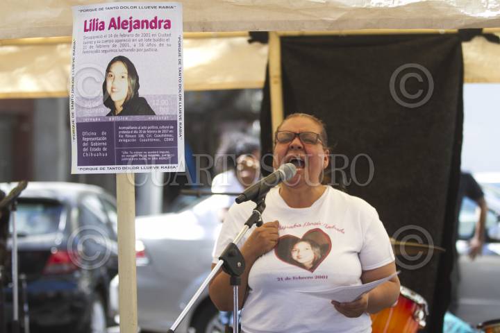 CIUDAD DE MÉXICO, 20FEBRERO2017.- Se realizó un acto de protesta político-cultural para pedir justicia por el asesinato de Lilia Alejandra García Andrade, quien desapareció un 14 de febrero de 2001 en Ciudad Juárez, y su cuerpo apareció en un lote baldío el 21 de febrero de 2001, el mitin se realizo afuera de la representación del gobierno de Chihuahua. Norma Esther Andrade, madre de la joven asesinada exigió que el gobierno de Javier Corral no le de la espalda al caso de su hija. FOTO: MOISÉS PABLO /CUARTOSCURO.COM