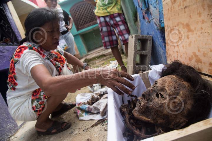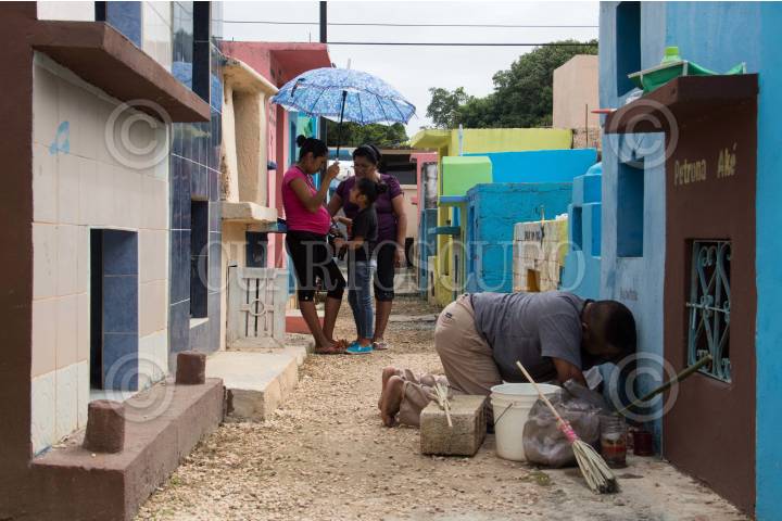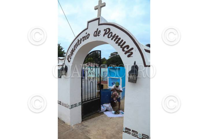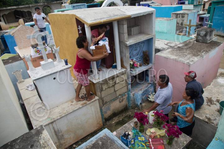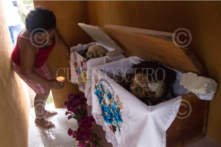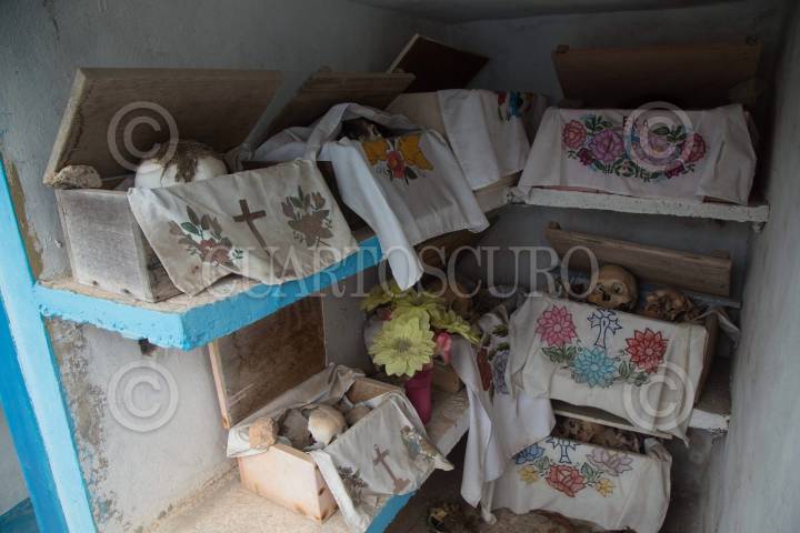 POMUCH HECELCHAKÁN, CAMPECHE, 30OCTUBRE2018.- La villa de Pomuch, que en maya significa “lugar en donde se asolean los sapos”, se ubica a 70 kilómetros de la capital del estado de Campeche, en el municipio de Hecelchakán. Cada año, previo a los festejos del día de muertos, los habitantes acuden al panteón desde muy temprana hora para realizar la tradicional “Limpieza de los santos restos”. Desde hace más de 18 años Venancio Tuz Chí es el sepulturero del poblado, en estas fechas ofrece sus servicios de limpieza y cambio de paño por la módica cantidad de 20 pesos. “Así como lo realizaron nuestros ancestros mayas, después de permanecer tres años enterrado, el cadáver es exhumado y listo para la primera limpia. En algunos casos debemos esperar más tiempo debido a que el difunto seguramente tomó mucho medicamento y por eso, su cuerpo se encuentra en estado momificado”, señala. Sin guantes ni cubre bocas, hombres y mujeres inician con el ritual extrayendo la osamenta del nicho. Utilizando una brocha o pedazo de tela limpian con cuidado y esmero cada uno de los huesos, para quitarles el resto de piel y polvo desde el más pequeño, hasta llegar al cráneo. Mientras los asean, las familias tienen la costumbre de platicar con los occisos para mantenerlos al tanto de lo que sucede en el poblado o familia. Después de la limpieza, cada uno de los restos se acomoda cuidadosamente adentro de la caja adornada con manteles nuevos y coloridos bordados. De acuerdo a los pobladores, las cajas deben permanecer abiertas con los cráneos expuestos al exterior, pues es parte de la tradición que reciban los rayos del sol y el aire fresco en estos días de festejos. Una vez depositadas las cajas con los restos al interior del nicho, los familiares colocan flores y encienden veladoras para alumbrar a las ánimas en su camino de regreso. Este peculiar ritual se realiza del 25 de octubre al 2 de noviembre. FOTO: MARTÍN ZETINA /CUARTOSCURO.COM