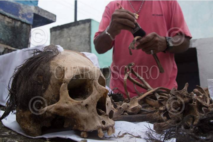POMUCH HECELCHAKÁN, CAMPECHE, 27OCTUBRE2017.- Como cada año, habitantes de esta villa acuden al cementerio para realizar la tradicional “Limpieza de los santos restos”. Después de tres años de enterrado, el cadáver es exhumado y listo para la primera limpia. Venancio Tuz Chí es sepulturero del camposanto, se dedica a hacer cambios de paño y limpieza de los restos desde hace 18 años cobrando 20 pesos por servicio. Mientras los asean, los familiares y amigos platican con los occisos para mantenerlos al tanto de lo sucedido en el poblado o familia. Al cambiar el paño y depositar los huesos dentro de la caja, acomodan el cráneo hasta arriba dejando la caja abierta dentro del nicho, para que les pueda dar el aire y el sol. Tuz Chí comenta que el aumento de las religiones protestantes y el desinterés de las nuevas generaciones ponen en riesgo la continuidad de este rito funerario. El secretario de cultura en el estado, Lic. Delio Carrillo Pérez, dio a conocer el nombramiento de “La Limpieza de los santos restos, ritual funerario de la comunidad maya de Pomuch” como Patrimonio Cultural Intangible del Estado de Campeche. FOTO: MARTÍN ZETINA /CUARTOSCURO.COM