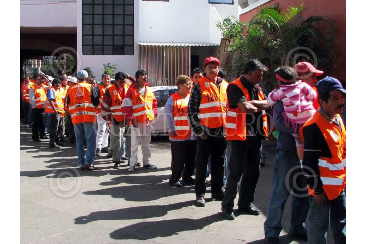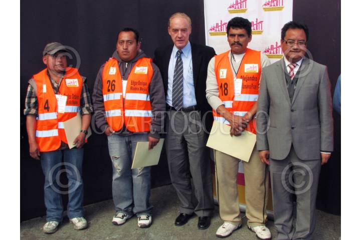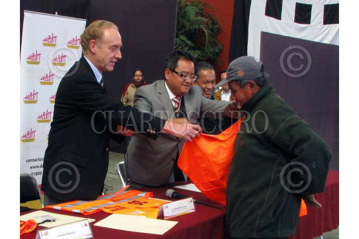 MEXICO, D.F., 13DICIEMBRE2010.- Eduardo Santillán Pérez, jefe delegacional de Alvaro Obregón, Benito Mirón Lince, secretario del trabajo capitalino, durante la entrega de chalecos y permisos a Franeleros de esta ciudad. FOTO: CUARTOSCURO.COM