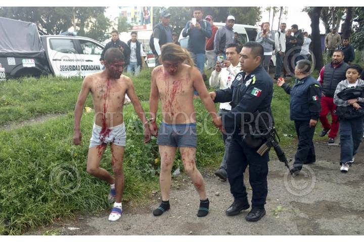 ECATEPEC, ESTADO DE MÉXICO, 3SEPTIEMBRE2016.- Dos jóvenes, quienes presuntamente intentaron asaltar una combi de transporte público, estuvieron a punto de ser linchados por los mismos pasajeros de la combi ruta México-Coacalco-San Pablo y anexas, en la Av. José López Portillo en la colonia ejidos de Emiliano Zapata. Los hombres recibieron una tremenda golpiza y fueron despojados de sus ropas, instante en que llego la policía para rescatarlos y llevarlos ante el ministerio público. FOTO: ESPECIAL /CUARTOSCURO.COM