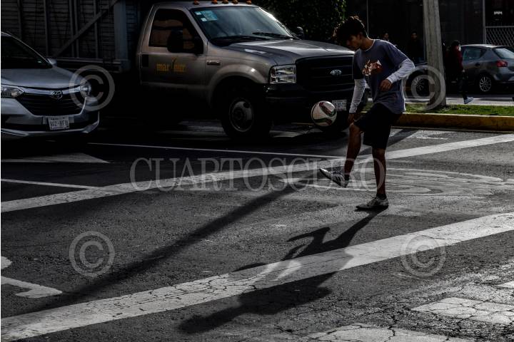 Un joven realiza trucos con un balón de futbol en espera de poder ganar unas monedas, ésto sobre avenida Instituto Politécnico Nacional.