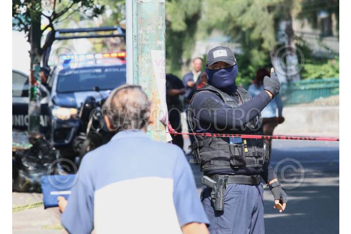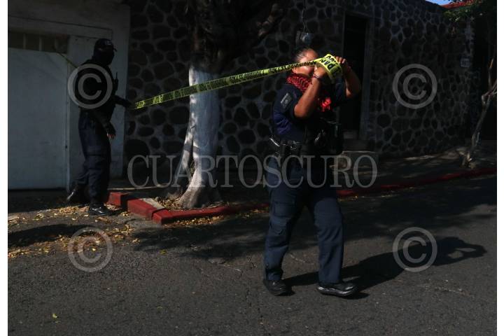 CUERNAVACA, MORELOS, 14NOVIEMBRE2023.- Policías de la ciudad acordonan una calle adyacente a donde fueron asesinadas dos mujeres esta mañana. Después de las 09:00 se reportaron disparos en la calle Alpes de la colonia Miraval, a unos pasos de la secundaria número 1 y un colegio privado. Presuntamente se trataría de madre e hija que fueron atacadas a balazos cuando se encontraban detenidas para que la menor llegara a su escuela. El feminicidio fue atendido por más de 20 elementos policiacos quienes se dedicaron a acordonar la escena del crimen con cinta amarilla en espera de los investigadores y peritos en criminalística de la Fiscalía General del Estado, quienes iniciaran las averiguaciones del caso. Finalmente, trabajadores del Servicio Médico Forense levantaron los cuerpos sin vida y los trasladaron a la morgue en espera de que sean identificados y reclamados. FOTO: MARGARITO PÉREZ RETANA/CUARTOSCURO.COM