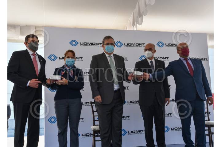 Recorrido en la Planta de Liomont sobre el proceso de formulado y envasado de la vacuna de AstraZeneca COVID-19 realizado por el canciller Marcelo Ebrard Causabon, acompañado por Carlos Alfonso Tomada Embajador de Argentina, Alfredo Rimoch, Director General de Laboratorios Liomont.