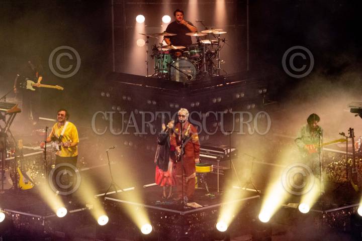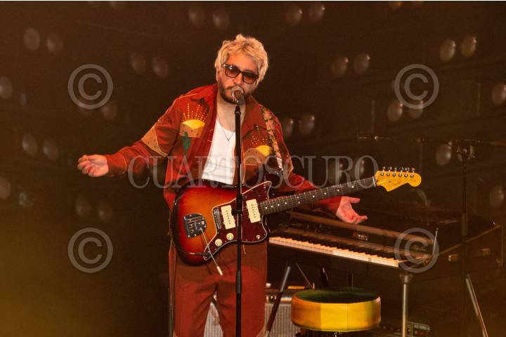 CIUDAD DE MÉXICO, 26JULIO2025.- Santiago Casillas, vocalista y guitarrista de Little Jesus, banda mexicana de indie rock, durante su presentación esta noche en el Palacio de los Deportes. FOTO: MARIO JASSO/CUARTOSCURO.COM