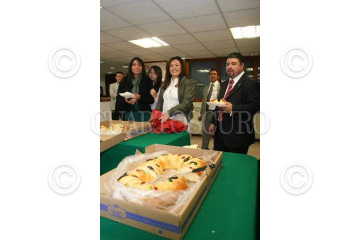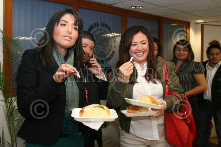 MÉXICO D.F., 06ENERO2011.- Alejandra Barrales, del PRD, Israel Betanzos, del PRI y Lizbeth Rosas Moreno, del PRD, legisladores de la Asamblea Legislativa, cortaron la tradicional rosca por el día de reyes en las instalaciones de la Asamblea Legislativa. FOTO: GUILLERMO PEREA/CUARTOSCURO.COM