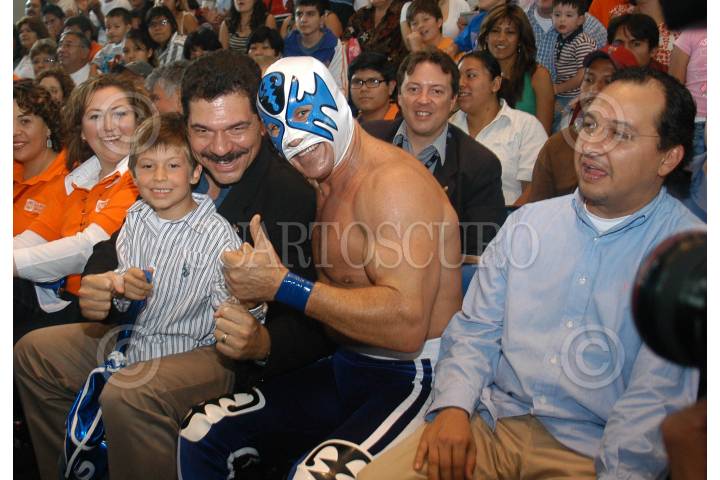 MÉXICO D.F. 17JUNIO2007.-El diputado Gerardo Pliego y Max Cortazar Coordinador de Comunicación Social de la Oficina de la Presidencia asistieron acompañados de sus hijos a las instalaciones del CEN del PAN donde con una función de lucha libre, celebraron el día del padre.En la imagen son acompañados por el luchador Lizmark. FOTO: GUILLERMO PEREA/CUARTOSCURO.COM