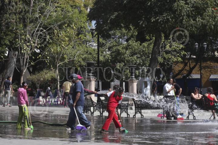 OAXACA, OAXACA, 14ENERO2012.- Un grupo de tinguistas quienes todos los viernes se instalan en el Paseo a Juárez "El Llano" se dedicaron a dar tequio, pues se reunieron y comenzaron a limpiar dicho espacio. Con escobas, agua y jabón comenzaron a barrer el lugar. FOTO: ARTURO PÉREZ ALFONSO/CUARTOSCURO.COM