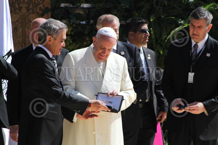 CIUDAD DE MÉXICO, 13FEBRERO2016.- El Papa Francisco recibió las llaves de la ciudad de manos de Miguel Ángel Mancera, jefe de Gobierno de la Ciudad de México. FOTO: CUARTOSCURO.COM