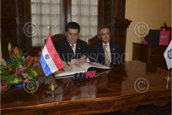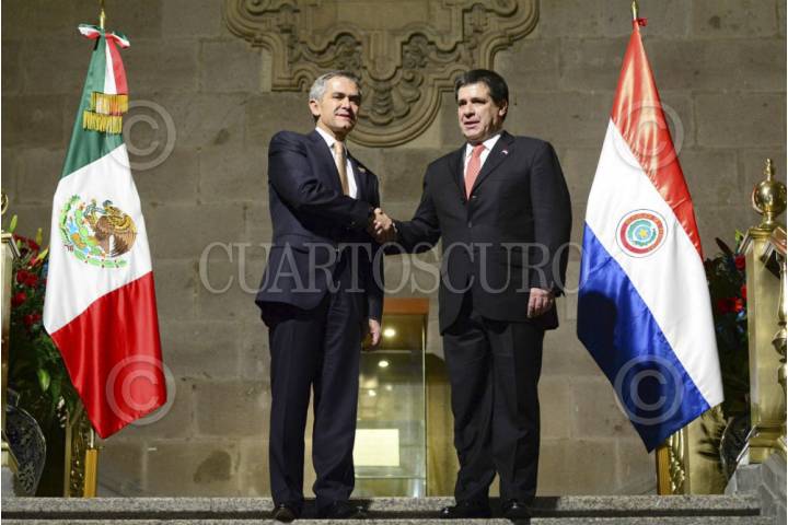 CIUDAD DE MÉXICO, 26AGOSTO2016.- Miguel Ángel Mancera Espinosa, jefe de gobierno de la Ciudad de México, entregó al Presidente de la República del Paraguay, Horacio Manuel Cartes Jara, la Llave, Medalla, réplica de las “Alas de la Ciudad” y Pergamino que lo declaran como Huésped Distinguido de la capital del país. FOTO: CUARTOSCURO.COM