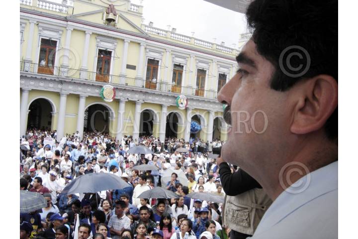 XALAPA, VERACRUZ 26AGOSTO2007.- Al término del cierre de campaña entraron al palacio de gobierno entre empujones para pedirle al gobernador que saque las manos del proceso electoral yfueron recibidos por el el secretario de gobierno . FOTO: JORGE VALDÉS /CUAARTOSCURO.COM