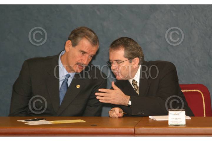 México, D.F., 27ENERO2004.- Vicente Fox Quesada, presidente de la república y Javier Gavito Mohar, director general del Banco del Ahorro Nacional y Servicios Financieros, durante el acto oficial ¨Logros y Retos de la Banca Popular¨, en la residencia oficial de los Pinos. FOTO: Moisés Pablo/CUARTOSCURO.COM
