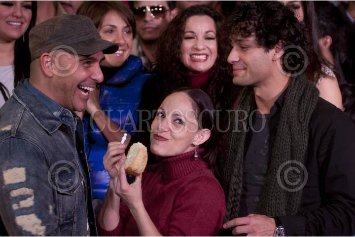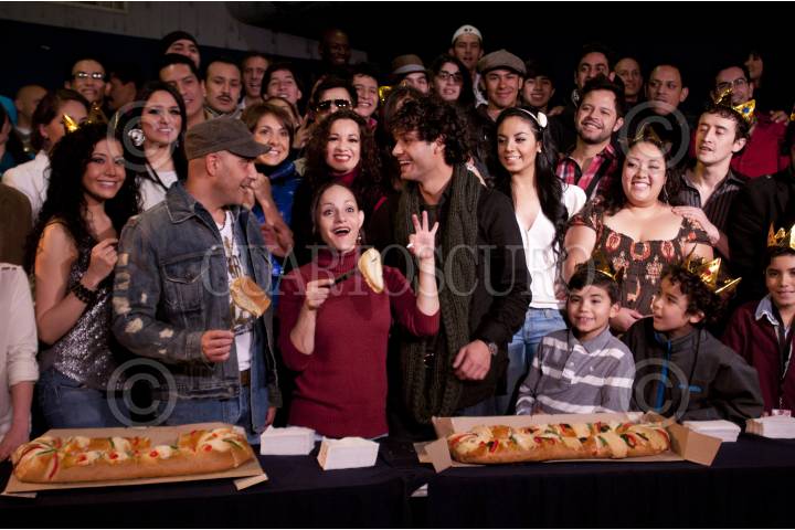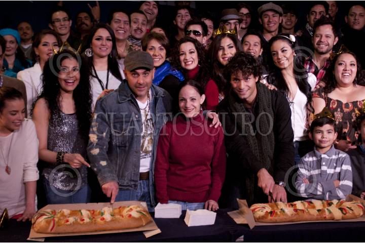 MÉXICO, D.F., 06ENERO2012.- Los actores, Héctor Suárez Gomíz y Lola Cortez (centro) cortaron la ya tradicional Rosca de Reyes, los actores que son protagonistas de la obra de teatro "Peter Pan" convivieron con la prensa y sus familias. FOTO: FRANCISCO RODRÍGUEZ/CUARTOSCURO.COM