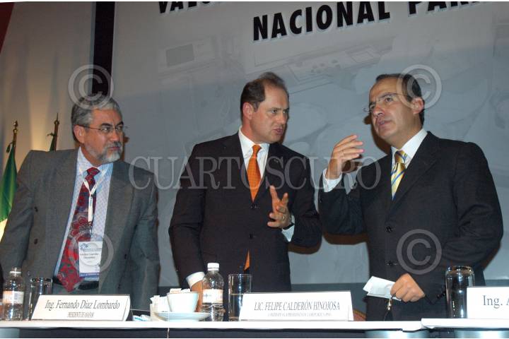 MÉXICO, D.F. 06DICIEMBRE2005.- Héctor Carrillo González, (ANAFAM) Fernando Díaz Lombardo, presidente de ANAFAM y Felipe calderón Hinojosa, candidato del PAN a la presidencia de la República, durante el Congreso de la Industria farmacéutica Nacional. FOTO: Iván Stephens/CUARTOSCURO.COM