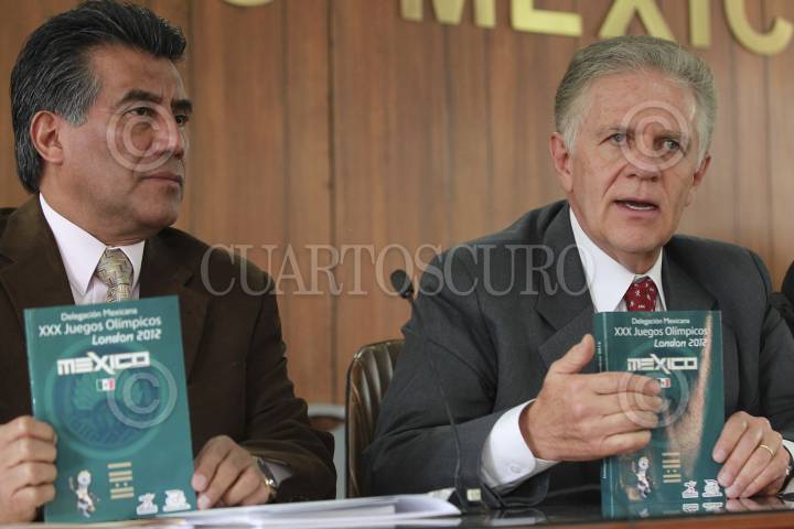 MÉXICO, D.F., 12JULIO2012.- Ricardo Contreras, secretario general del Comité Olímpico Mexicano, y Carlos Padilla Becerra, presidente de la Comisión especial para Londres 2012, durante la presentación del libro "Delegación Mexicana XXX Juegos Olímpicos London 2012". FOTO: IVÁN MENDEZ /CUARTOSCURO.COM