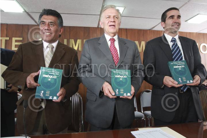 MÉXICO, D.F., 12JULIO2012.- Ricardo Contreras, secretario general del Comité Olímpico Mexicano, Carlos Padilla Becerra, presidente de la Comisión especial para Londres 2012, y Jaime Cadaval Baeza, jefe de misión para Londres 2012, durante la presentación del libro "Delegación Mexicana XXX Juegos Olímpicos London 2012". FOTO: IVÁN MENDEZ /CUARTOSCURO.COM