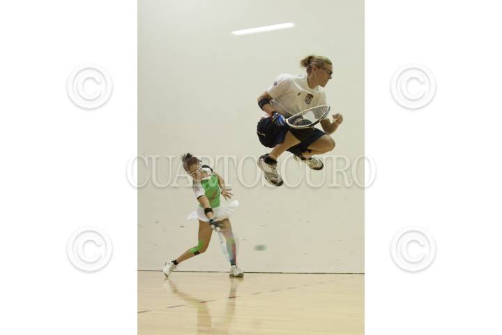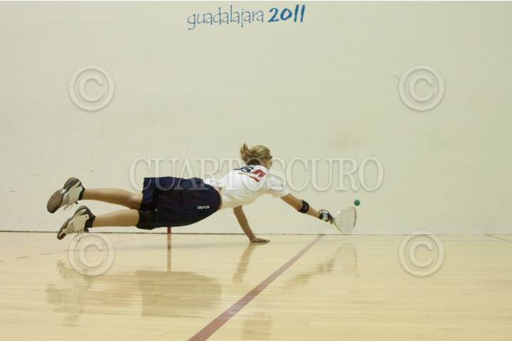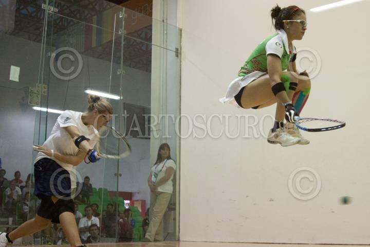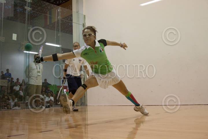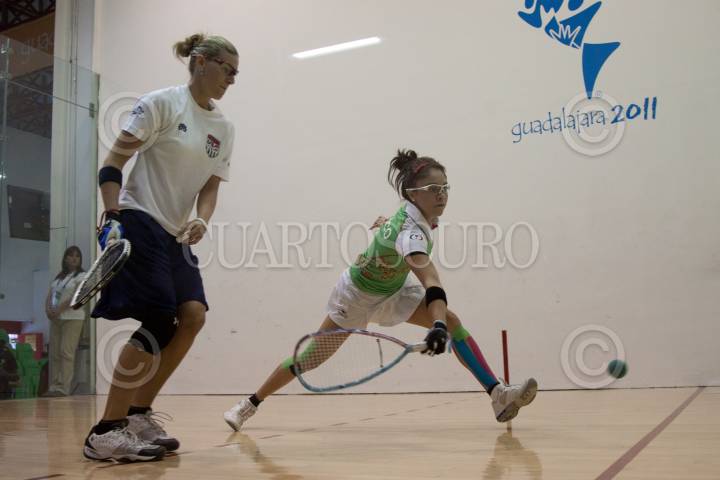 GUADALAJARA, JALISCO, 25OCTUBRE2011.- La mexicana Paola Longoria venció a la estadounidense Rhonda Rajsich en el partido individual de raquetbol donde se disputa la medalla de oro por equipos. FOTO: IVÁN STEPHENS/CUARTOSCURO.COM