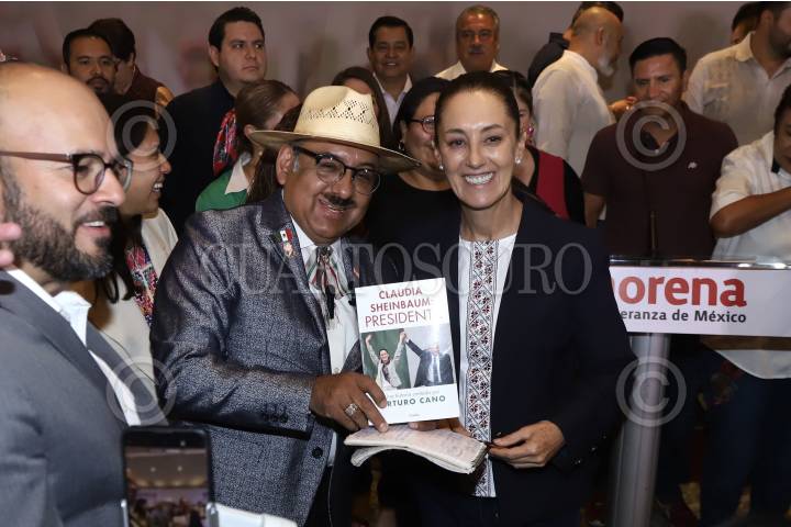 CIUDAD DE MÉXICO, 15SEPTIEMBRE2023.- La Coordinadora en Defensa de la Transformación, Claudia Sheinbaum firmó un libro a Carlos Pozos “Lord Molécula” al término de la conferencia que ofreció en conjunto con el presidente nacional de Morena, Mario Delgado sobre los trabajos de organización del partido rumbo a las elecciones del 2024. FOTO: EDGAR NEGRETE LIRA/CUARTOSCURO.COM