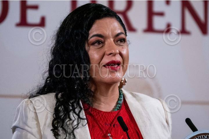 Alejandra Frausto durante la conferencia matutina, donde se trataron los temas de salud y el programa nacional de reconstrucción del patrimonio histórico.