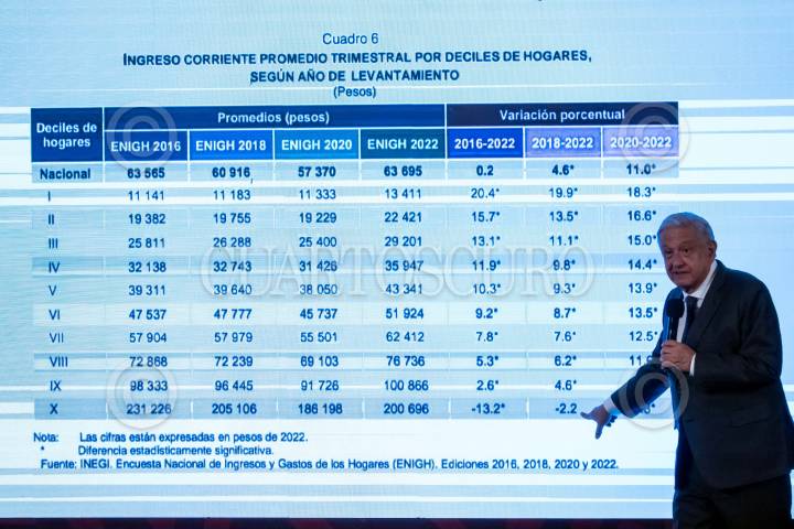 Andrés Manuel López Obrador muestra una tabla con la suma de los ingresos de los habitantes, durante la conferencia matutina, en que se trataron los temas de salud y el programa nacional de reconstrucción del patrimonio histórico.