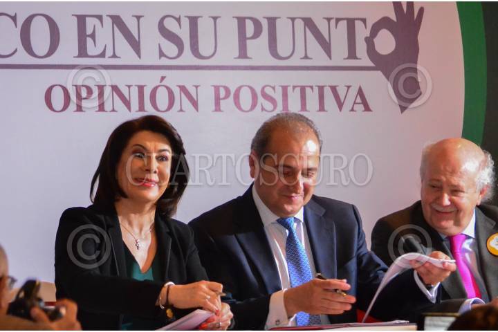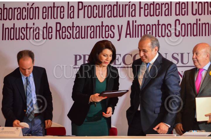 MÉXICO, D.F., 24JUNIO2015.- Lorena Martínez, procuradora federal del consumidor, y a la derecha Hugo Vela, presidente de la Cámara Nacional de la Industria de Restaurantes y Alimentos Condimentados (Canirac), después de la firma de convenio entre las dos instituciones. FOTO: MARÍA JOSÉ MARTÍNEZ /CUARTOSCURO.COM