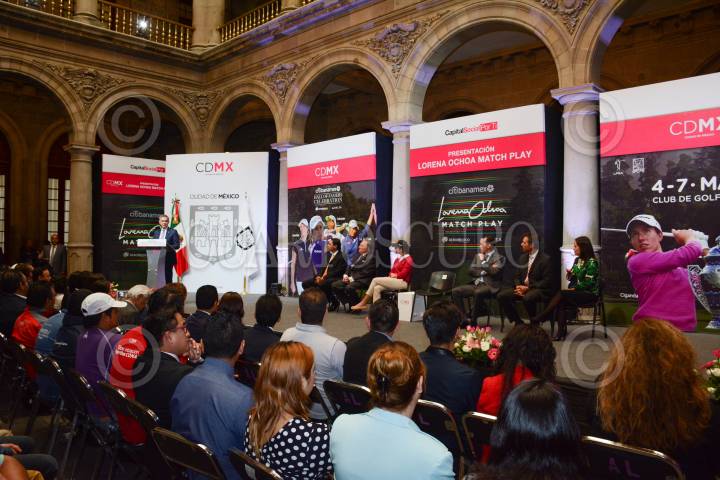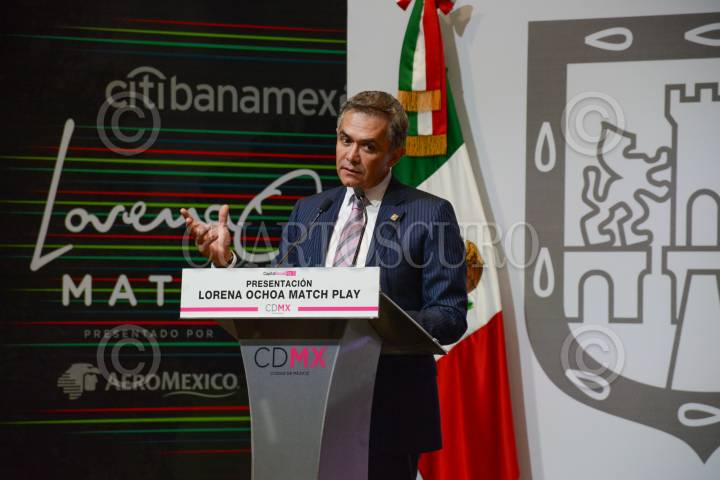 CIUDAD DE MÉXICO, 26ABRIL2017.- Miguel Ángel Mancera, Jefe de Gobierno, durante la presentación del “Lorena Ochoa Match Play”. En el torneo participará Lorena Ochoa, lo que marca su regreso a la actividad, además compartirá el campo con la sueca Annika Sorenstam, la estadoudense Juli Inkster y la coreana Se Ri Pak. FOTO: MARIO JASSO /CUARTOSCURO.COM