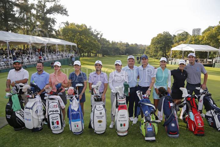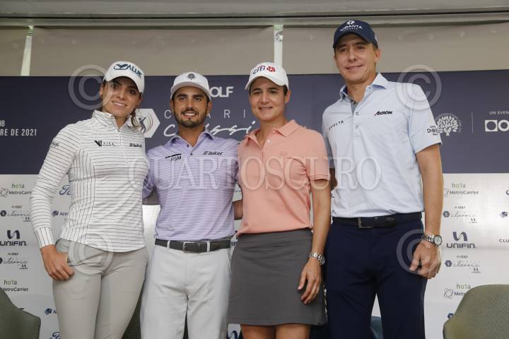 Gabriela López, Abraham Ancer, Lorena Ochoa y Carlos Ortiz, posan durante el inicio de la primera edición del torneo de Golf Charity Classic.