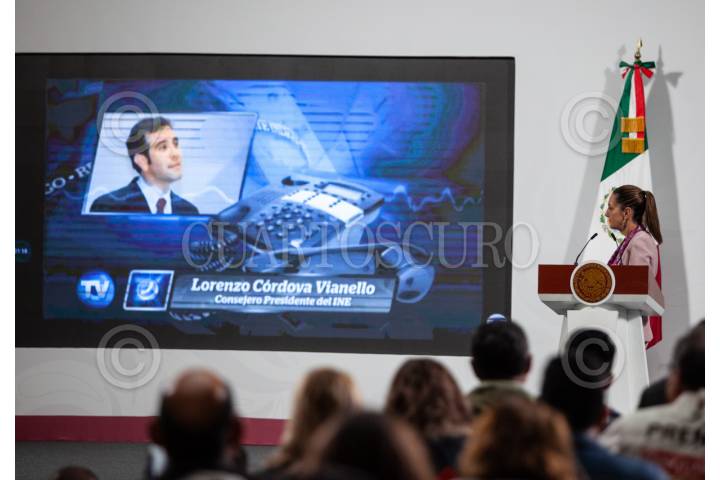 CIUDAD DE MÉXICO, 07AGOSTO2025.- Claudia Sheinbaum Pardo, presidenta de México durante conferencia de prensa en Palacio Nacional donde mostró una fracción de llamada filtrada del exconsejero presidente del Instituto Nacional Electoral (INE), Lorenzo Córdova Vianello. FOTO: ANDREA MURCIA /CUARTOSCURO.COM