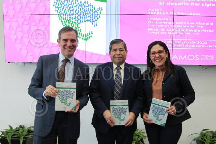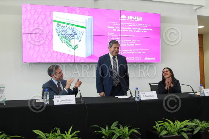 Lorenzo Córdova Vianello, Consejero Presidente del INE; Claudia Zavala Pérez, Consejera Electoral del INE y Tonathiu Guillen López, escritor, encabezaron la presentación del libro "México, nación transterritorial, El desafío del siglo XXI".