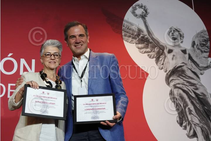 Alejandra Latapí y Lorenzo Córdova Vianello, exconsejero del INE, durante su participación en la conferencia Momento Mexicano 2023, una visión compartida del País", organizada por Harvard Club de México