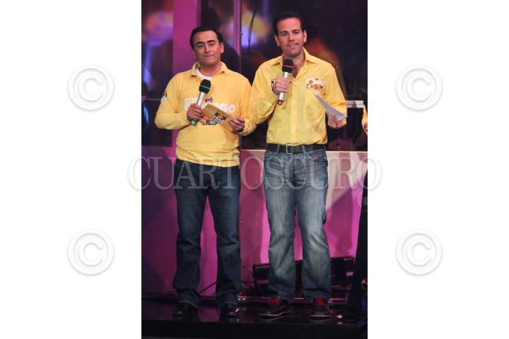 MÉXICO, D.F., 04DICIEMBRE2010.- Adal Ramones, conductor y Carlos Loret de Mola, periodista, ayer por la noche durante el inicio del Teleton 2010 realizado en el foro 2 de Televisa San Ángel. Como cada año se realiza este evento el cual tiene como objetivo reunir recursos para ayudar a niños con capacidades diferentes en su rehabilitación. FOTO: MISAEL VALTIERRA/CUARTOSCURO.COM