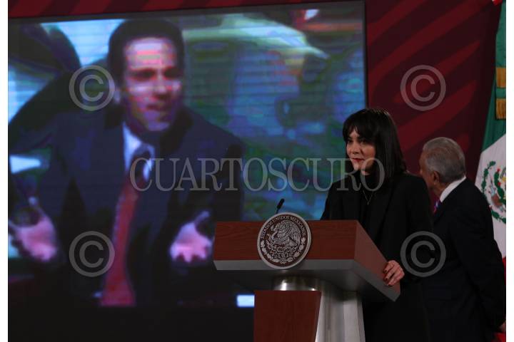 Andrés Manuel López Obrador, presidente de México acompañado de Ana Elizabeth García Vilchis durante conferencia de prensa en Palacio Nacional.