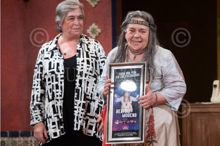 Angelina Moreno entrego un reconocimiento a su hermana la actriz Beatriz Moreno por sus 50 años de trayectoria, dentro de la obra Los Guajolotes Salvajes en el Teatro Ignacio López Tarso.