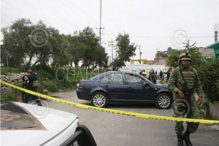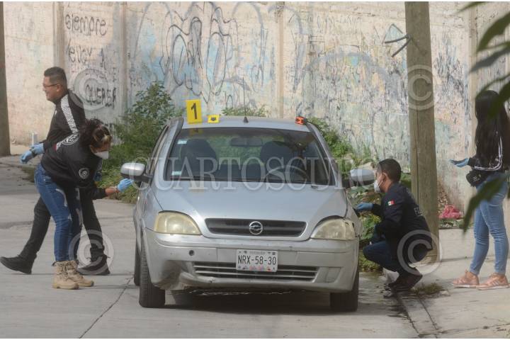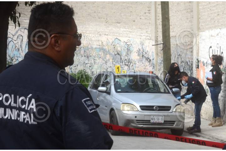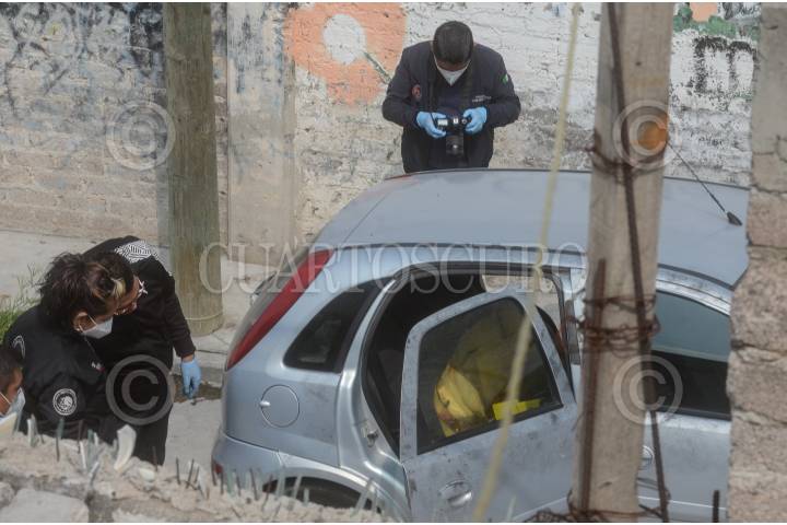 Policías y forenses del Estado de México acudieron al levantamiento del cuerpo abandonado de un hombre en la parte trasera de un automóvil.