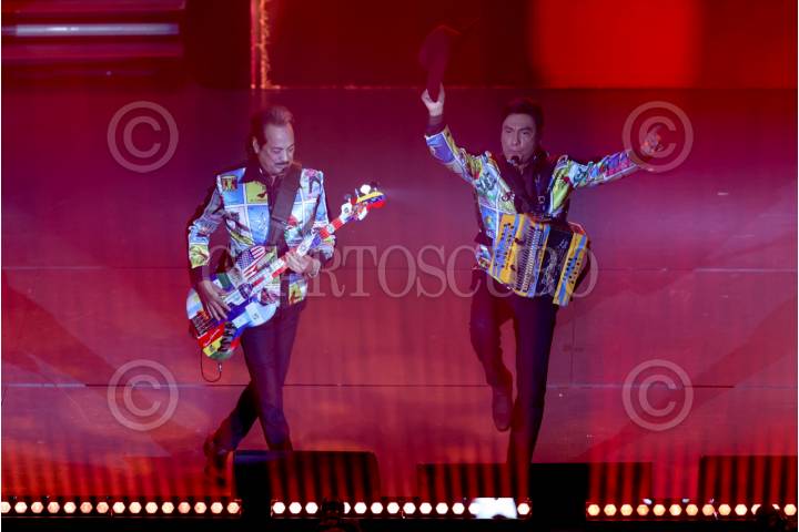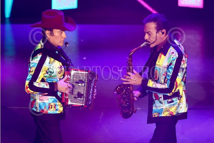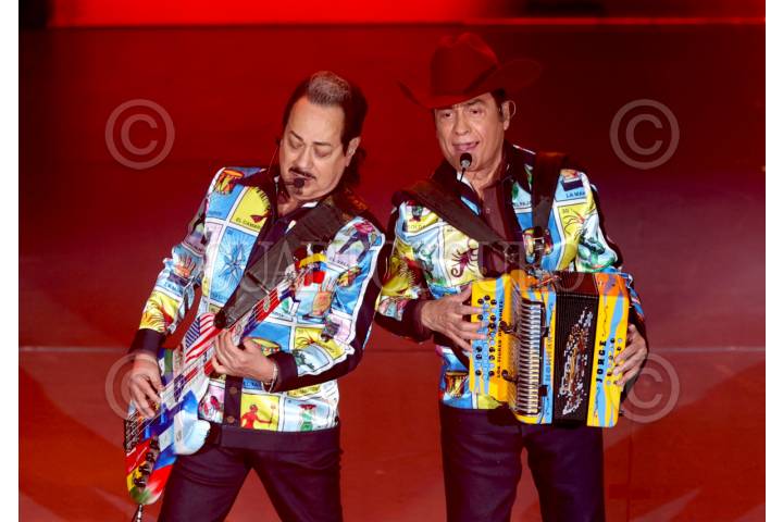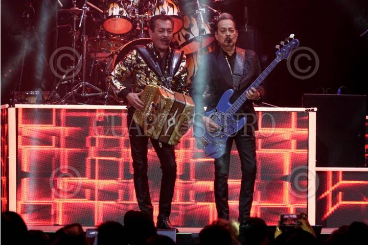 CIUDAD DE MÉXICO, 01AGOSTO2025.- Hernán Hernández, bajista y Jorge Hernández, acordeonista de "Los tigres del norte" banda mexicana de música norteña, durante su presentación esta noche en el Palacio de los Deportes como parte de su gira "La lotería 2025". FOTO: MARIO JASSO/CUARTOSCURO.COM