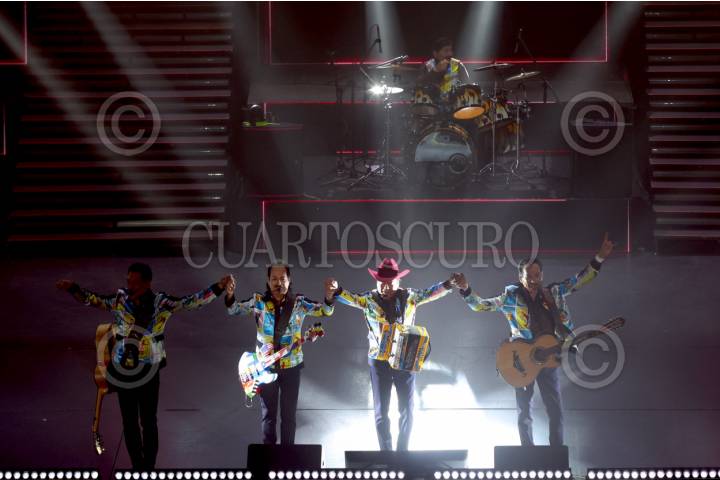 CIUDAD DE MÉXICO, 01AGOSTO2025.- Luis Hernández Angulo, bajosextista; Hernán Hernández, bajista; Jorge Hernández, acordeonista; Eduardo Hernández, bajosextista y saxofonista de "Los tigres del norte" banda mexicana de música norteña, durante su presentación esta noche en el Palacio de los Deportes como parte de su gira "La lotería 2025". FOTO: MARIO JASSO/CUARTOSCURO.COM