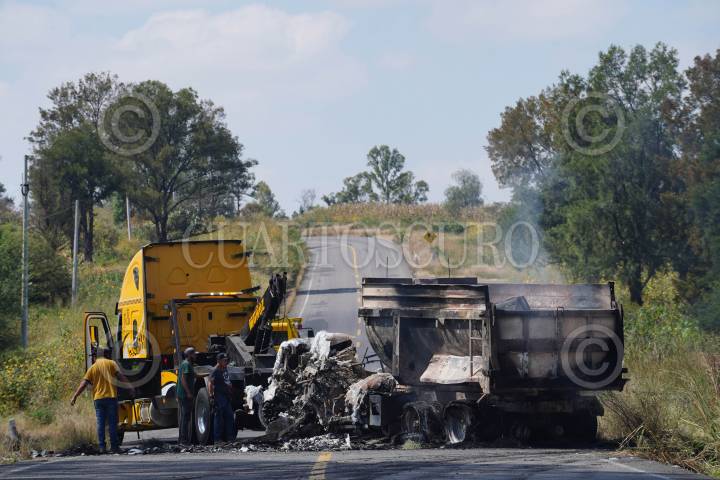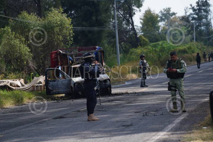 ZINAPECUARO, MICHOACÁN, 05NOVIEMBRE2024.- Resultado de un enfrentamiento entre dos grupos de la delincuencia organizada deja al menos 9 automotores incendiados en los municipios de Zinapécuaro, Charo, Álvaro Obregón, Indaparapeo. De acuerdo con las autoridades policiales, el ataque que realizaron delincuentes contra elementos de la Guardia Civil (GC) alrededor de las 04:00 horas de este martes, tuvo lugar sobre la carretera Zinapécuaro-Acámbaro, a la altura de la población de San José del Rincón, hecho que desató varias quemas de vehículos en municipios colindantes; por fortuna los agentes resultaron ilesos. FOTO: JUAN JOSÉ ESTRADA SERAFÍN /CUARTOSCURO.COM