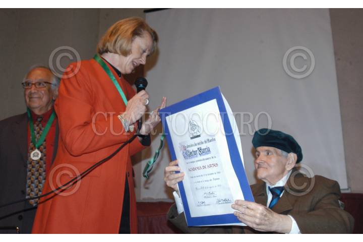 MEXICO D.F. 24AGOSTO2005.- En ceremonia celebrada en el auditorio del Museo Nacional de San Carlos, La Academia de Artes integró al fotógrafo Héctor García a la sección de gráfica de ese cuerpo colegiado en la que figuran destacados personajes del campo de las artes. Ademas fue inaugurada la exposición En el blanco, formada por 35 fotografías originales y representativas de la amplia producción de Héctor García, a manera de retrospectiva. Louise Noelle le colocó una medalla de reconocimiento al reprtero grafico. FOTO: Germán Romero/CUARTOSCURO.COM