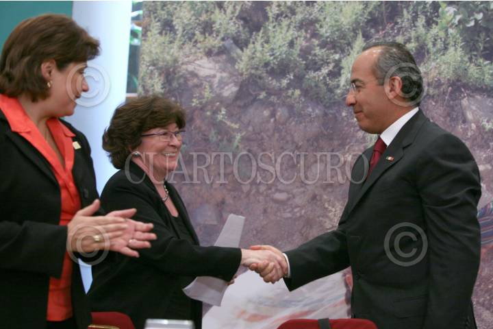 MEXICO D.F., 06FEBRERO2008.- Louise Arbour, Alta Comisionada de las Naciones Unidas de las Naciones Humanas saluda a Felipe Calderón Hinojosa, Presidente de México, durante la ceremonia del convenio de cooperación en materia de derechos humanos con nuestro país. FOTO: ALFREDO GUERRERO/CUARTOSCURO.COM