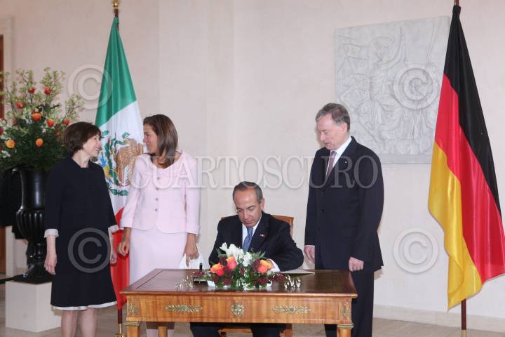 BERLIN, ALEMANIA, 03MAYO2010.- Eva Louise Köhler, esposa del mandatario aleman Horst Köhler (derecha), Margarita Zavala, esposa de Felipe Calderón Hinojosa, presidente de México, durante la ceremonia de bienvenida que se realizó en la residencia oficial del Palacio de Bellevue. El presidente de México continúa su gira por el viejo continente. FOTO: ALFREDO GUERRERO/CUARTOSCURO.COM