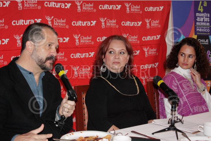 MÉXICO, D.F., 04NOVIEMBRE2009.- Eugenio Toussaint, Lourdes Lecona, coordinadora de enlace operativo del Teatro de la Ciudad Esperanza Iris y Susana Harp, cantante mexicana durante la presentación de la 4ta Muestra de Artes Escenicas de la Ciudad de México que se realizará del 5 al 29 de noviembre en 16 escenarios de la capital del país. FOTO: ESSENE HERNÁNDEZ/CUARTOSCURO.COM