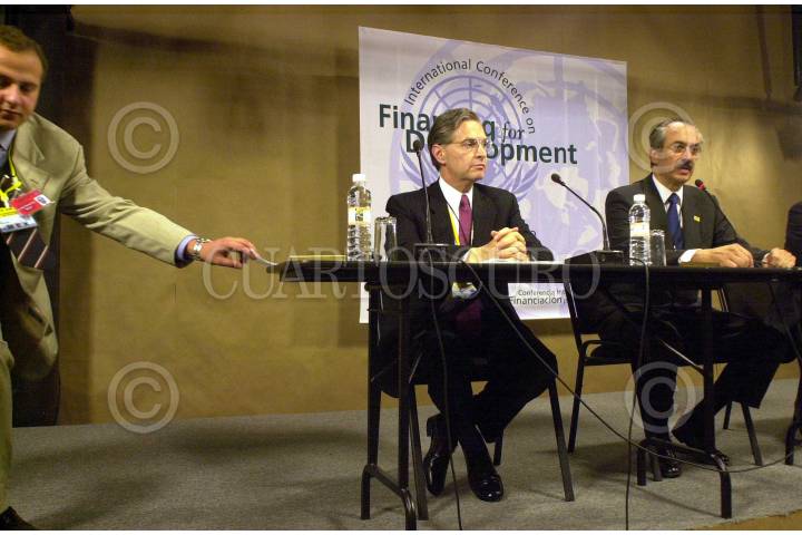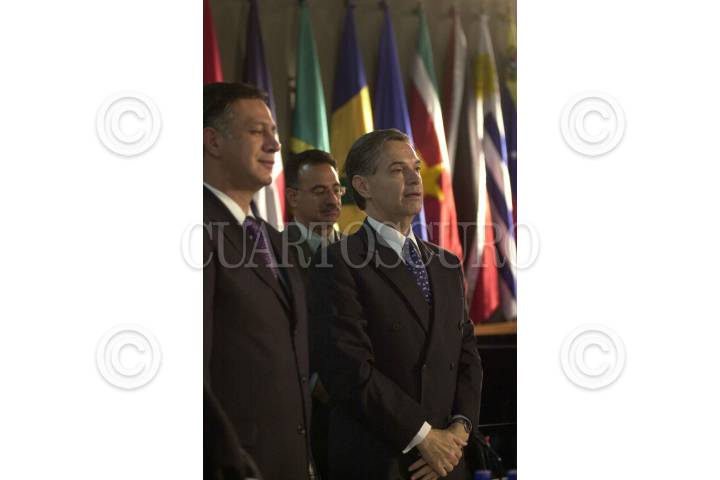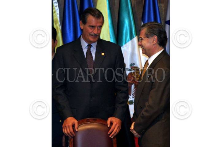 Vicente Fox saluda a Cesar Gaviria, secretario de la Organización de Estados Americanos, durante la clausura de la "Conferencia Especial sobre seguridad" organizada por este organismo. El secretario de Relaciones Exteriores, Luis Ernesto Derbéz, atestigua el acto. FOTO: Juan Pablo Zamora/CUARTOSCURO.COM
