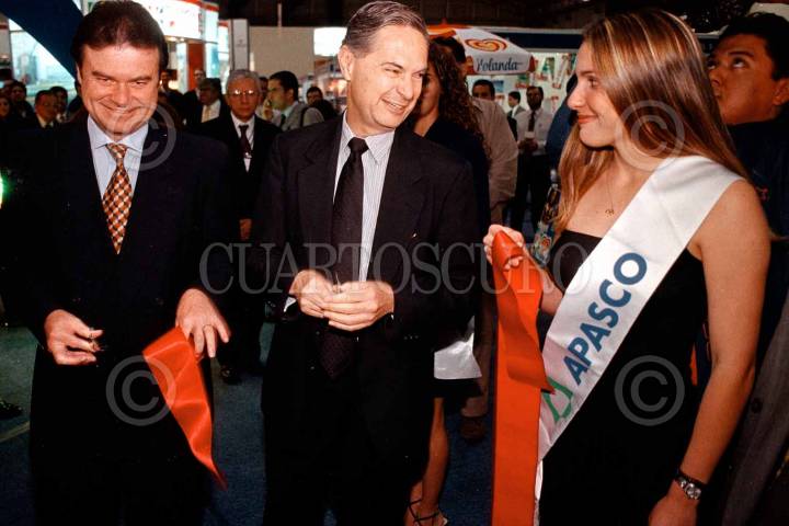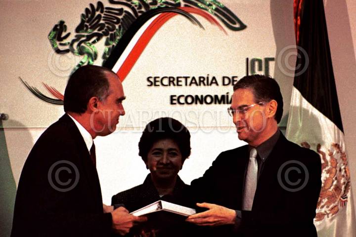 Luis Ernesto Derbez Bautista Secretario de Economía, y Reinhar Jung presidente del Consejo Ejecutivo de Volskwagen durante el anuncio de inversión de Volskwagen en México. El cual el secretario de Economía, expresó que está dispuesto a aceptar la decisión que el Presidente Vicente Fox tome en relación a quedarse en la dependencia o sustituir a Jorge Castañeda. FOTO: Eunice Adorno/CUARTOSCURO.COM