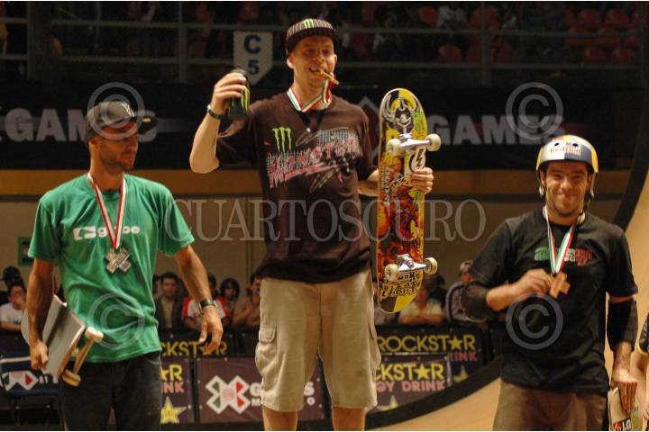 MÉXICO,D,F.,09SEPTIEMBRE2007.- Rodrigo Menezes segundo lugar, Pierre Luc Gagnon primer lugar y Rodrigo Menezes tercer lugar de la final del skate vert de los X Games en el Palacio de los Deportes., durante la premiacion. FOTO:SASHENKA GUTIERREZ/CUARTOSCURO.COM